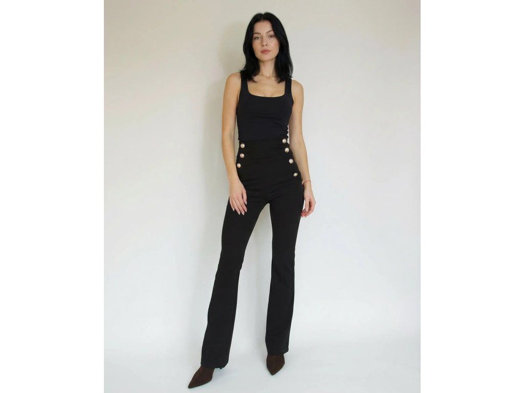 Čierne nohavice s vysokým pásom zdobené výraznými dekoratívnymi gombíkmi po oboch stranách, ktoré vytvárajú efekt zvýrazňujúci pás a dodávajú štýlový, mierne vojenský nádych. Strih je priliehavý v hornej časti a smerom dolu sa jemne rozširuje, čo opticky predlžuje postavu. Materiál je pružný a pohodlný, príjemne obopína siluetu.