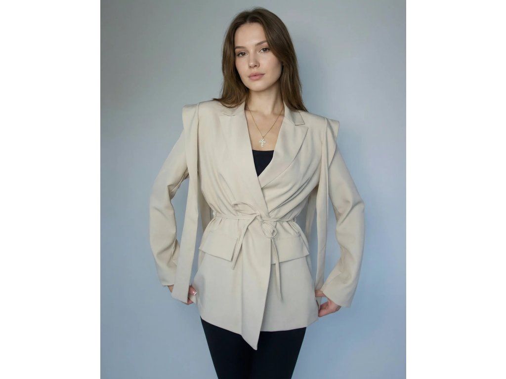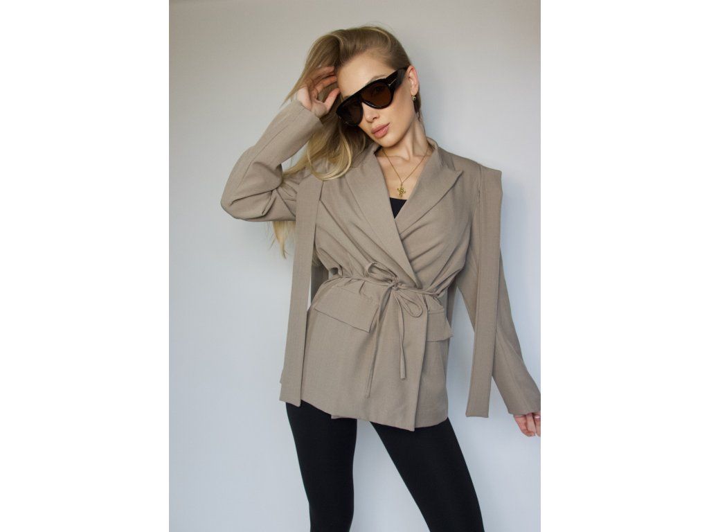 Toto elegantné dámske sako spája klasický strih s moderným nádychom. Má voľnejšiu siluetu, ktorá sa v páse sťahuje tenkým opaskom na viazanie, čím krásne zvýrazňuje postavu. Sako je vyrobené z ľahkého, príjemného materiálu a doplnené o klopový golier a decentné ramenové výstuhy, ktoré dodávajú celkovému vzhľadu štruktúru a eleganciu. Skvelo sa hodí ako k formálnym outfitom do práce, tak aj k ležérnejším kombináciám s džínsami či legínami.