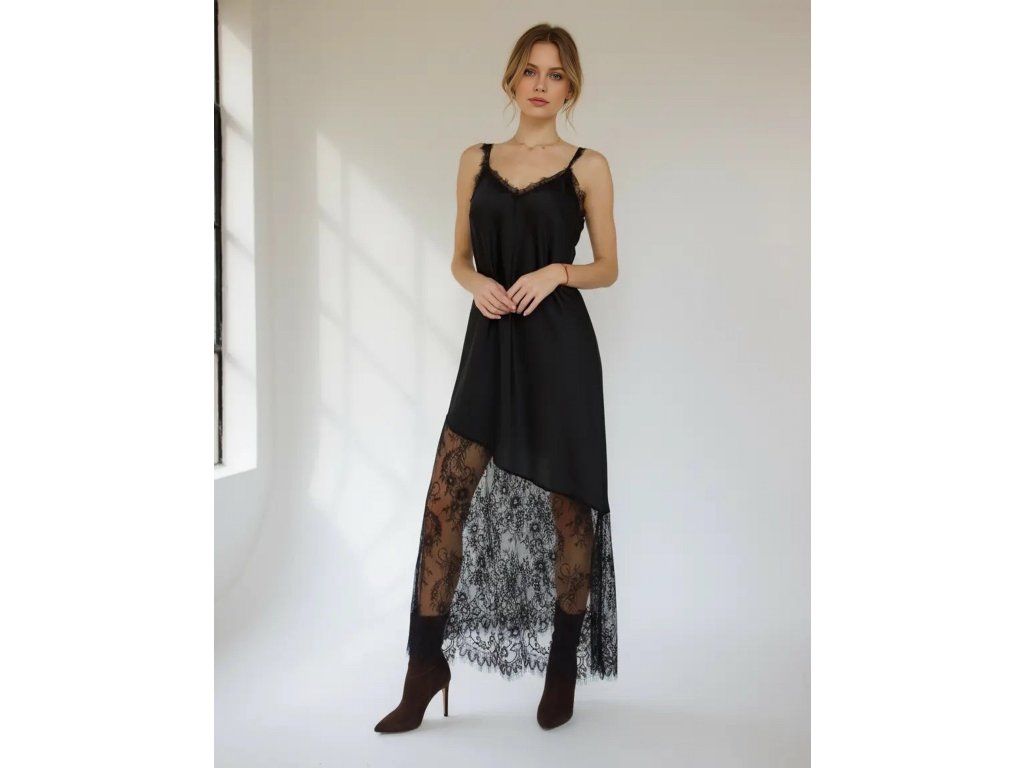 Elegantné čierne šaty so saténovým efektom doplnené asymetrickou bohatou čipkou, ktorá predlžuje siluetu a dodáva zmyselný, moderný vzhľad. Jemný čipkovaný výstrih zvýrazňuje ženskosť, zatiaľ čo ľahučký materiál krásne splýva. Ideálne na večer, oslavy aj špeciálne príležitosti. Veľkosť UNI sadne na XS, S, M, L.