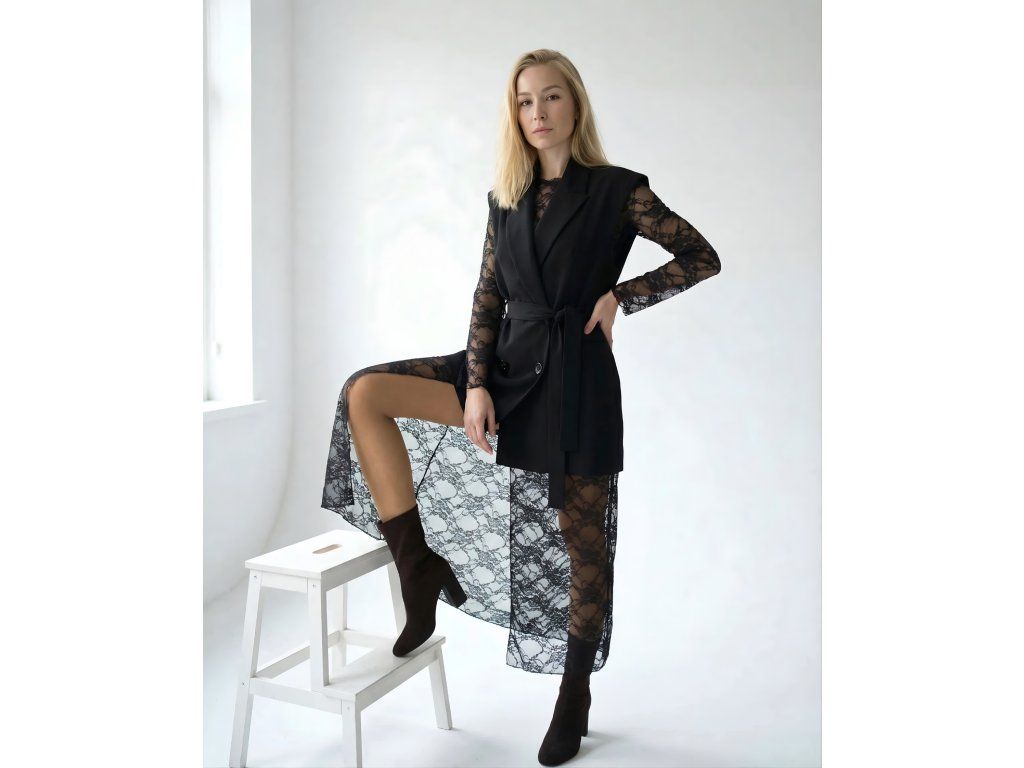 Tieto elegantné čipkované šaty prinášajú dokonalú rovnováhu medzi zmyselnosťou a sofistikovanosťou. Celé šaty sú ušité z jemnej čiernej čipky s výrazným vzorom, ktorá pôsobí exkluzívne a nadčasovo. Priesvitná čipkovaná štruktúra vytvára ľahký, vzdušný efekt a opticky predlžuje siluetu. Veľkosť UNI sadne na XS, S, M, L.