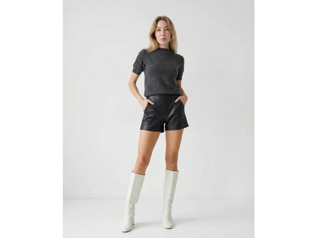 Tieto štýlové talianske šortky z kvalitnej imitácie kože pôsobia moderne a elegantne. Šortky sú ideálne na prechodné obdobie a do chladnejších dní v kombinácií s pančuchami. Majú čistý, uhladený strih s jemným leskom a praktickými bočnými vreckami. Zapínanie je skryté na zadnej strane, čo zabezpečuje dokonale hladký predný vzhľad a pôsobí veľmi sofistikovane. Perfektný základ pre trendy mestské outfity.