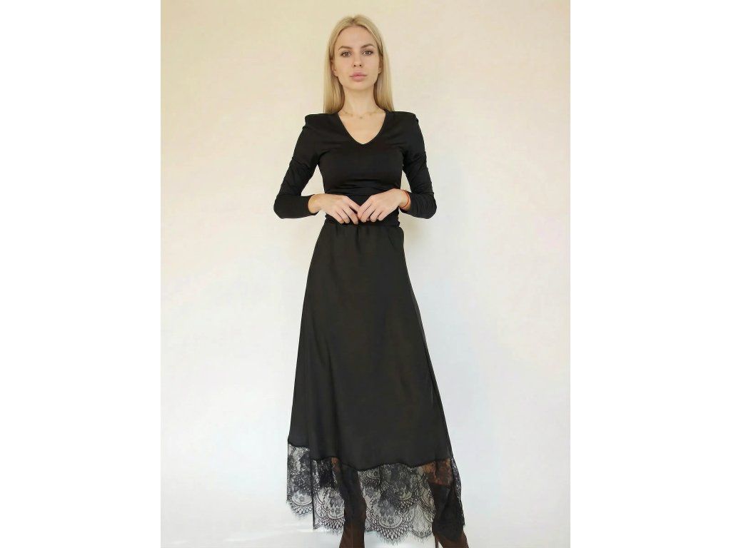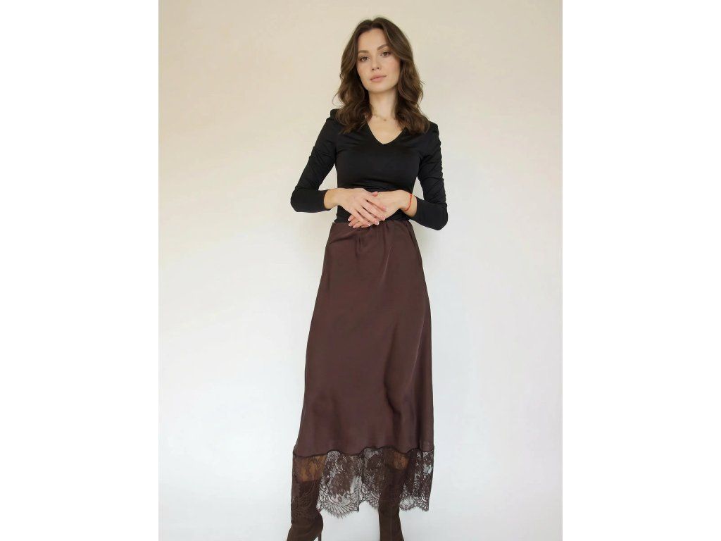 Táto nádherná talianska sukňa spája eleganciu saténového lesku s jemným romantickým čipkovým detailom na spodnom leme. Pôsobí žensky, luxusne a jej výrazná silueta dokáže pozdvihnúť každý outfit – od jednoduchého basic topu až po večerný styling.