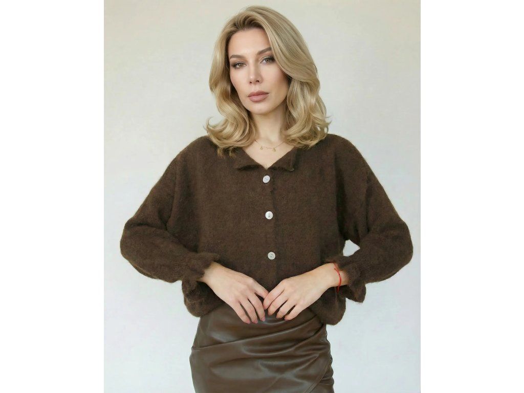 Jemný a príjemne nadýchaný taliansky sveter s voľným strihom, ktorý pôsobí ležérne, no zároveň štýlovo. Zapínanie na kontrastné gombíky dodáva modelu elegantný detail, zatiaľ čo mäkký materiál s 10 % podielom vlny poskytuje hrejivosť a komfort. Rukávy majú nenápadne zvlnený okraj a celkový dizajn sa výborne kombinuje s modernými kúskami na každodenné nosenie. Veľkosť UNI sadne na S, M, L.